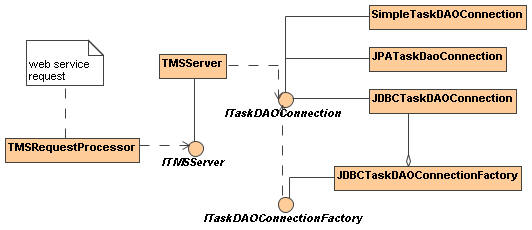 TMSRequestProcessor 从 xml 信息中解析出关键信息,并将这些信息移交给 TMSServer 对象处理,TMSServer 来内部通过 TaskDaoConnection 对象来与存储层交互。如下图所示: