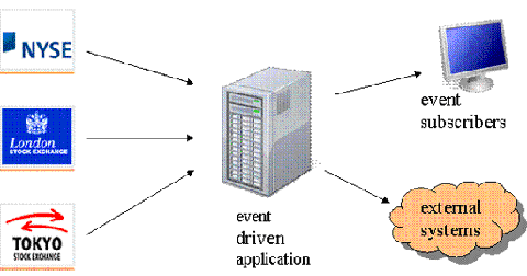 WebLogic Event Server是专门针对实时事件驱动型应用程序而设计的一种应用平台。事件驱动型应用程序的关注点是处理事件流,通常由外部源将事件流交付给Event Server实例。比如说,在图1演示的场景中,事件驱动型应用程序正在处理来自多个证券市场的证券交易事件。当应用程序在交易事件中检测到一个特定的模式时,便会向事件订阅者或其他外部系统发出通知。通常,从外部源接收到的事件要比应用程序生成的事件高几个数量级。.