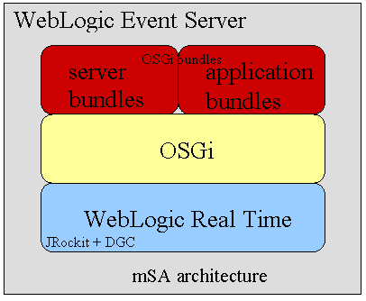 就其本质而言,WebLogic Event Server是一个基于BEA微服务架构(microServices Architecture,mSA)的、模块化的轻量级应用服务器。图2是Event Server软件栈的高级结构图。图2显示Event Server运行于BEA的实时JVM之上,该实时JVM提供了确定性垃圾收集机制(deterministic garbage collection,DGC)。这种平台适合在确定性行为和低延时方面具有苛刻要求的应用程序,比如说各种财务应用程序。但是,Event Server是纯Java应用程序,因此它也可以运行在其他JVM之上。
