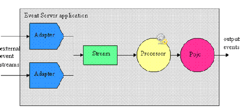 如图4所示,Adapter组件负责提供与各种外部事件源的连通性,比如说市场数据提要。从本质上说,Adapter组件将传入的事件流数据转化为事件对象,以供事件处理网络中的下游组件使用和处理。Event对象可以是公开集合类型属性的JavaBean,也可以是条目表示属性名称/值对的Map。