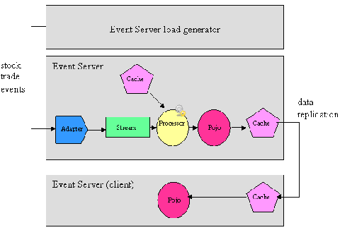 事件从加载生成程序流向in-play应用程序,然后由in-play应用程序进行处理。输出事件将发布给重复GemFire缓存,然后重复GemFire缓存将这些事件分发给应用程序的客户机。在本例中,客户机是运行在单独Event Server流程中的另一个Event Server应用程序。客户机POJO将注册为缓存的监听程序,以便于接收输出事件的通知。