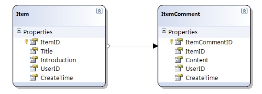Item实体对应Item表,每个Item拥有一些评论,也就是ItemComment。Item实体中有一个Comments属性,是ItemComment实体的集合。这个例子将会使用这个再简单不过的模型。