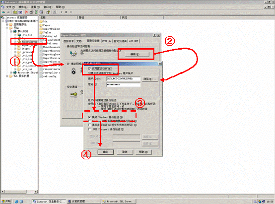 集成到SQL Server 2005中的Reporting Services已经将报表模板发布到IIS服务器,客户端通过浏览器访问时,默认会弹出Windows集成身份验证的对话框。如果在IIS配置里面把允许匿名(IUSR_**)访问的选项勾选,客户端再次访问的时候,会提示IUSR_** 访问权限不足。