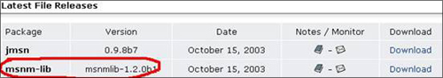 jMSN的主页中提供两个部件供下载如下图所示,其中jmsn是一个完整的JAVA应用程序,下载解压后可以直接运行,运行的界面跟微软的MSN Messenger很类似,包括操作上都非常一致,如果你的操作系统是Linux或者其他那都可以直接用它来替代微软的程序。另外一个是msnm-lib,这个就是我们今天要介绍的API,它仅仅是一个开发包,在jmsn组件中已经包含了这个包。