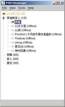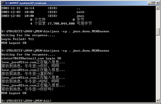 应该说这个界面跟MSN Messenger是非常类似的。用户可以通过它发送和接收消息等。在启动jMSN的命令行窗口中可以看到jMSN与服务器之间通讯的详细信息。