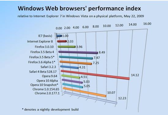 Betanews同时还对其他浏览器进行了评测,IE 8的物理分数是2.03,Apple's Safari 4 beta的分数是14.12说明Apple的最新浏览器比微软的最新浏览器快14倍。