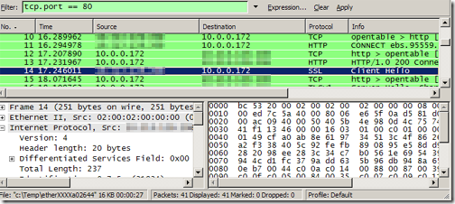 最开始我是使用Firefox+Wireshark拦截80端口的包的,但是浏览器向服务器发出SSL Hello后传输的内容都会被加密,Wireshark所看到的都是密文,相当的不方便。如图: