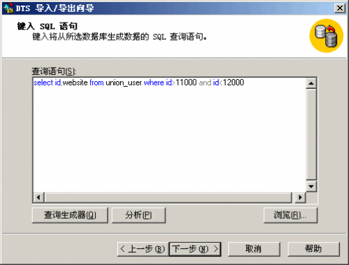 平时用的多的都是把整张表的数据从MSSQL中导出,今天要导出的数据只需几个字段,打开导出向导发现也很简单,只需在向导的第三步中选择"用一条查询指定要传输的数据":