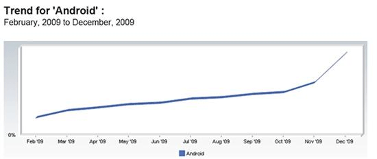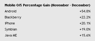 纵观Android去年一整年的变化趋势,你会发现这款手机操作系统的实力不容小觑,它始终保持着稳步的增长,尤其是11月份、12月份,可能是得益于假期的到来或是摩托罗拉Droid的推动,Android的增长曲线出现了更明显的变化。