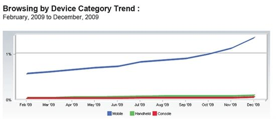 根据权威市场调研机构Net Applications的最新统计数据,12月份使用手机浏览器访问网络的用户激增,几乎每款智能手机操作系统都在市场份额上取得了很大攀升。这其中最引人注目的当属Google的Android系统,在12月份,其增幅高达54.8%。根据Net Applications的数据,手机浏览量目前已经占据整体Web浏览量的1.3%,相比Chrome的4.63%、Opera的2.3%,手机浏览器的值得表扬。12月份,手机浏览量增长了0.23%,几乎达到了11月份增幅(0.12%)的两倍。