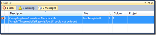 但是这种方式对于VS 2010则行不通,因为T4引擎在解析和编译模板的时候并不会从项目引用列表中去定位目标程序集。所以,对于上面的T4模板,会出现如下的编译错误。
