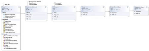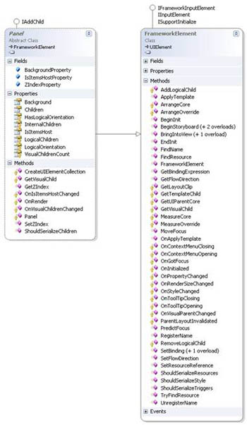 于今天只是讲如何开发一个自定义的Panel,所以在清楚了基类的前提下,首先得了解它有哪些属性和事件,这样就可以确定哪些是不需要单独写、哪些是需要override。下图就是Panel和基类FrameworkElement 的类图: