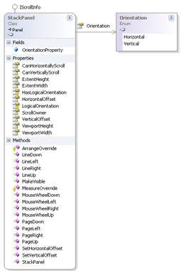 StackPanel就是将子元素按照堆栈的形式一一排列,通过设置面板的Orientation属性设置了两种排列方式:横排(Horizontal默认的)和竖排(Vertical)。纵向的StackPanel默认每个元素宽度与面板一样宽,反之横向亦然。如果包含的元素超过了面板空间,它只会截断多出的内容。 元素的Margin属性用于使元素之间产生一定得间隔,当元素空间大于其内容的空间时,剩余空间将由HorizontalAlignment和VerticalAlignment属性来决定如何分配。其他属性,大家可以看看如下类图: