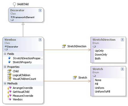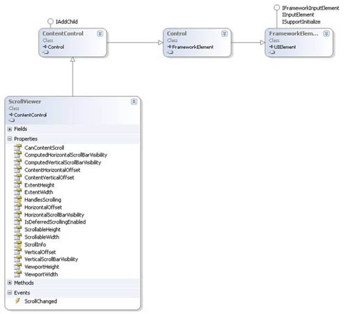 通常用户界面中的内容比计算机屏幕的显示区域大,大出的部分就会破坏原有的布局。利用 ScrollViewer 控件可以方便地使应用程序中的内容具备滚动功能。这样大出的部分就可以正常显示出来了。常用属性、事件和继承关系见下面类图: