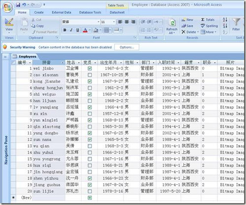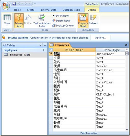 首先,我们使用Microsoft Access 2007数据库,创建一个数据表,命名为Employees,创建一些字段,给每个字段指定数据类型。请看下图:
