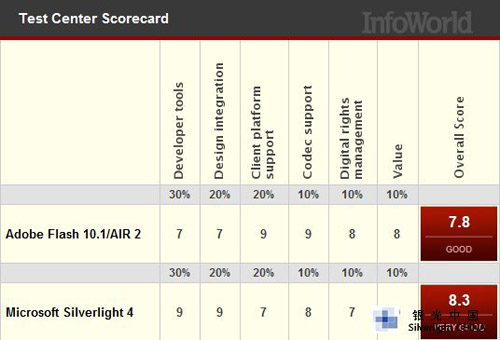 最后附上InfoWorld.Com对Flash10.1/AIR2和Silverlight 4各项测试评分表,供大家参考: