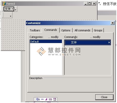Type不用变,Caption设置为New。确定后,New出现在Commands中。还是选中New,将其拖放到Form上的MenuBar的File中。当拖至File时,File自动弹开,将New放置到弹开的空白处即可。其结果如右图。