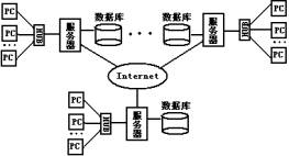 总部和各分店都配置了一台具有固定IP的服务器,其它电脑通过集线器与服务器相连,总部和各分店的服务器通过通信网络联接起来。