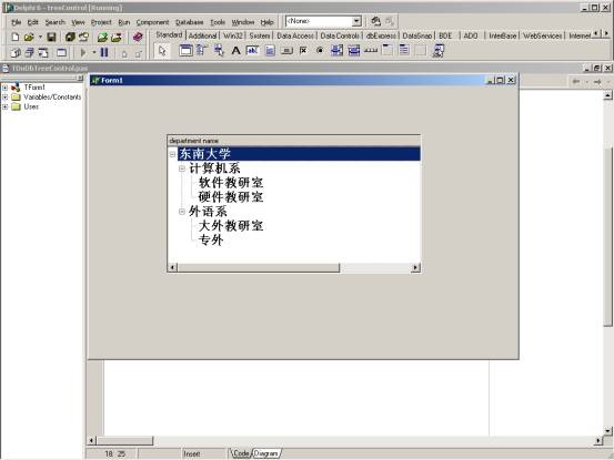 生成的数据集作为 TdxDBTreeList 的数据源;unitNo 作为 KeyField;superiorUnit 作为 ParentField 等。需要注意的是,其中 uintNo||' '是一种字符串连接运算,之所以要这么做是因为 unit 关系模式中 unitNo 的字段宽度为 6 位,而 teacher 中的 teacherNo 为 8 位,作为 TdxDBTreeList 的 KeyField 必须统一二者的宽度,否则可能出现问题,读者可以亲自试验。