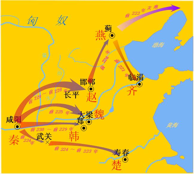 “箭头标绘”功能是TopMapGIS6.4.2最新开发的功能,主要应用于标识形势图、态势图。如下图“秦灭六国态势图”所示。