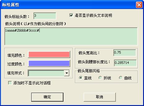 注意:当“填充样式”为默认值(没有填充样式)时,“填充颜色”表示标绘箭头的尾部颜色,“过度颜色”表示标绘箭头的头部颜色,标绘箭头的腰部填充颜色为从尾部的“填充颜色”到头部的“过度颜色”的过度值;当“填充样式”为用户选择的样式时,“填充颜色”表示用户选择样式的前景色,“过度颜色”不起作用。