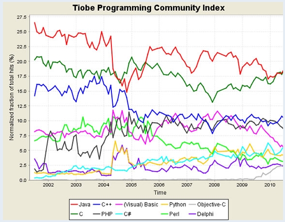 2010年8月TIOBE发布了新一期的编程语言排行榜,我们看到前5名的位置还没有变化,关键是第6名的C#与之后的Python互相调换了位置。这似乎对于.NET平台来说是一个好兆头,毕竟C#是.NET平台的一面旗帜。