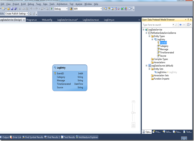 下面我们就使用WCF Data Service将服务器的Windows应用程序日志向外发布。我们的应用程序可以把日志直接就写在Windows的日志里,然后通过使用WCF Data Service非常容易的就将日志想其他需要的用户公开。WCF Data Service默认使用的是Entity Framework,使用Entity Framework参看文章WCF Data Service QuickStart,还有一个Reflection Provider,可以支持只读的数据服务,这个例子就是演示使用Reflection Provider,资料参看MSDN://msdn.microsoft.com/en-us/library/dd723653(VS.100).ASPx,还可以自定义实现一个Provider,参看文章自定义Data Service Providers。