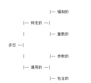 Luca Cardelli和Peter Wegner("On Understanding Types, Data Abstraction, and Polymorphism"一文的作者, 文章参考资源链接)把多态分为两大类----特定的和通用的----四小类:强制的,重载的,参数的和包含的。他们的结构如下: