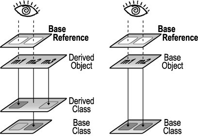 运行期的Derived2对象保持了接受m3()和m4()方法的能力。类型的限制使 Base的引用不能在编译期调用这些方法。编译期的类型检查像一套铠甲,保证了运行期对象只能和正确的操作进行相互作用。换句话说,类型定义了对象间相互 作用的边界。