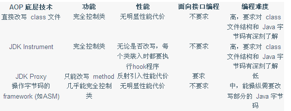 ASM这个Java字节码操控框架能被用来动态生成类或者增强既有类的功能。ASM可以直接产生二进制class文件,也可以在类被加载入Java虚拟机之前动态改变类行为。Javaclass被存储在严格格式定义的.class文件里,这些类文件拥有足够的元数据来解析类中的所有元素:类名称、方法、属性以及Java字节码(指令)。ASM从类文件中读入信息后,能够改变类行为,分析类信息,甚至能够根据用户要求生成新类。下图对当前接触常用的操作Java字节码框架进行了一个比较:
