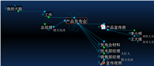 PersonalBrain则采用了立体网络的表现形式,与MindManager最大的不同之处在于,MindManager面对的是由思维而导致的行动,就是各种各样的任务,并将他们清晰的表示出来;而PersonalBrain则直面其本质:思维,它能够将你所有看到的,想到的,需要记录的,需要回忆的东西,全部放到软件中去,并且建立他们各自之间的联系,由此来形成一个庞大的网络。相比之下,PersonalBrain更像是你的“电子大脑”,使用PersonalBrain可以展示的是你的大脑中的一切信息,以及他们的联系。当你灵感突发,想到了某个东西,却又无法想起到底有多少事物与它相关的话,的作用会非常明显。只要在“电子大脑”中搜索它并点击,所有相关的内容一幕了然。