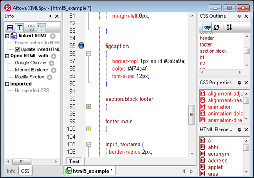 XMLSpy CSS编辑器出了支持CSS2.1,语法着色,上下文敏感输入助手窗口和下拉菜单,屏幕提示等,,还支持CSS3。