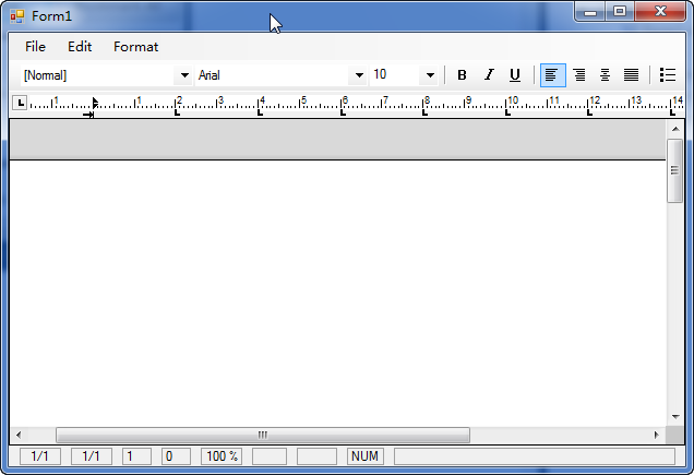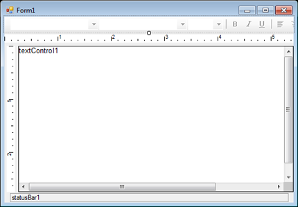 在工具相中选择【ButtonBar】并将其拖拽到窗体中,然后用同样方法添加一个【StatusBar】、两个【RulerBar】和一个【TextControl】控件到窗体上。添加控件之后分别设置它们的【Dock】属性,最终得到以下结果。
