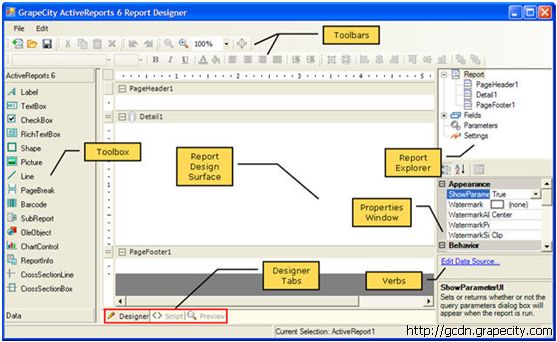 ActiveReports提供用户通过设计器快速的建立一些常用的报表. 以下, 会分别介绍ActiveReports设计器中的控件部分来帮助用户快速上手, 以及如何在设计报表的同时浏览报表.