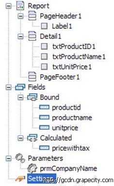 在ActiveReports里, Report Explorer把报表中视觉看到的元素用树的形式列出来, 帮助大家清楚每个报表各区域部分的详细数据. 也可以通过Report Explorer来添加, 删除参数, 字段等, 或者改变报表的一些设置. 我们可以直接在Report Explorer中点击section, control 或者报表本身来查看他们的属性. 在属性窗口来改变设置.