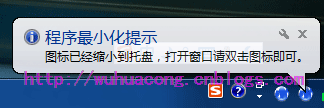 一般有些管理系统,为了防止客户随意关闭程序或者基于其他原因,一般会把 窗口【×】关闭按钮变为最小化,如大家熟悉的飞信、MSN等等,但是有些不是很熟悉的客户,最小化到托盘的时候,却不知道程序到了那里去了,因此,最小化的时候,伴随一个气泡提示信息,显得有一定的必要,如下截图所示。