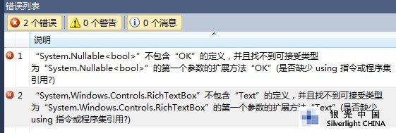 这段代码看上去其实并没有什么异议,可是,它放错了地方,是的,它放在了WPF的代码页里面,很多人会说,这又如何,不管是WPF,还是winform,甚至asp.net或者别的什么地方,代码是不会有什么差别的吧。是的,我也一直是这么认为的,可是,编译器报错了,除了OpenFileDialog需要引用一个叫Microsoft.Win32的命名空间以外,还出了其他问题: