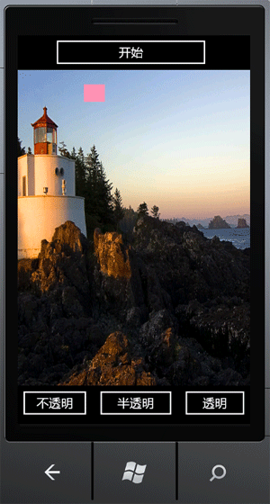 2、 在GamePage.xaml中加入控件,用三个按钮来控制碰撞的红色方块的开始与停止以及透明度的变化。