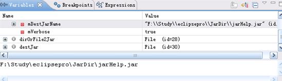 在Debug 视图的 Variables 小窗口中,我们可以看到 mDestJarName 变量的值为 " F:\Study\eclipsepro\JarDir\jarHelp.jar "