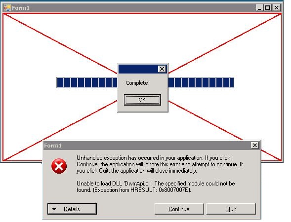 有了这个功能强大的托管类库的支持,可以非常方便地调用Windows7的API来实现那些非常酷的效果。不过这里 有一个小问题需要解决,当你在你的应用程序中使用了这个类库并且在Windows7下实现了想要的效果,如果用户运行的Windows环境是XP或 2003,那么你的程序会抛出异常,类似于下面的截图。