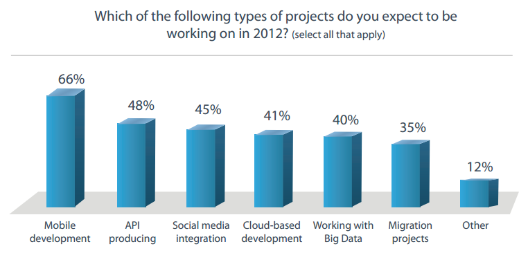 概述:PHP支持公司Zend刚刚发布了《Zend Developer Pulse》(开发者脉动全球调查报告)。该调查项目从2011年11月末开始,全球共有3335个开发者参与该项调查,其中来自大企业、中小企业和独立软件开发者都有。