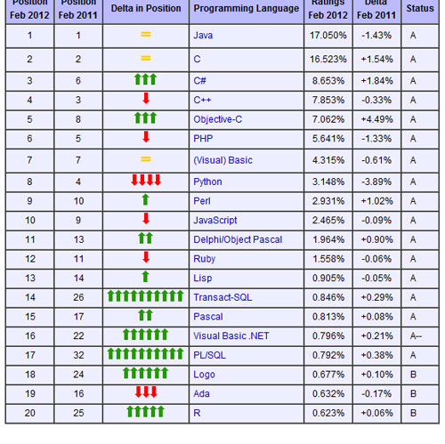 TIOBE 2012年 2 月编程语言排行榜已经发布,本月 C# 挤进前三,占领季军位置,C++降至第四名。Visual Basic 惨遭冷谈,呈现下滑趋势;而 VB.NET 受到了开发者们的追捧,进入榜单前 20 名,从上个月的 24 位跃至16位。从走势图中可看出,Objective-C依然发展迅猛,荣膺 2011 年度语言桂冠。其他编程语言值得关注的有:Groovy 逐渐逼近榜单前 20,CFML(ColdFusion)回归至 Top 50,排名 44 位。