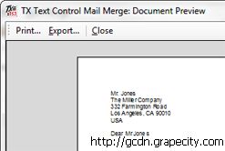 这实际是打开一个新的窗体,窗体包括一个TX Text Control和一个简单的工具栏。通过DocumentServer.MailMerge组件在后台完成模板与数据库中数据合并的工作,这一个合并操作只需3行代码: