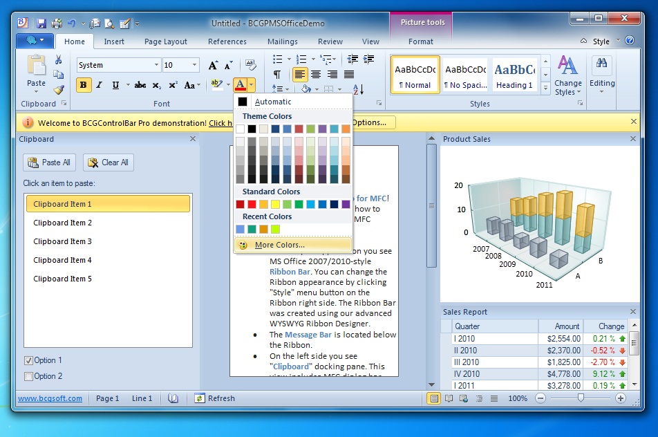 概述:本示例演示了使用BCGControlBar如何创建类似Microsoft? Office 2007/2010 Word界面风格的应用程序。
