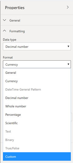 为此,首先在字段列表中选择字段,然后在属性窗格的格式化卡中选择自定义格式选项。