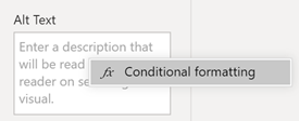 Alt文本是现在具有条件格式的第一个功能。这在可访问性方面确实是一个巨大的进步。现在可以根据视觉的当前过滤器状态动态地更改当视觉对象处于焦点时由屏幕阅读器读取的Alt文本。例如,您可以在alt文本中调出最高和最低类别,并确信它将始终反映视觉中的当前数据。