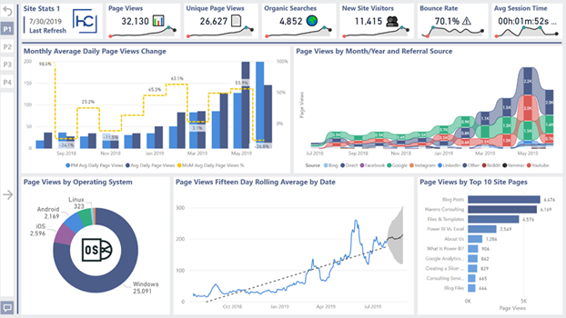 该报告本身使用户能够对每日页面浏览量进行深入分析,包括预测和可调滚动平均值、月环比流量增益或损失、访问的永利最大(官方)网站、流量来源随时间变化的趋势等。此外,该报告还包含许多Power BI特性和功能的优秀示例,包括书签、假设参数、高级条件格式和自定义视觉效果。总体而言,此报告提供了一种出色的开箱即用的Power BI体验,是一种增强Google Analytics数据的好方法。