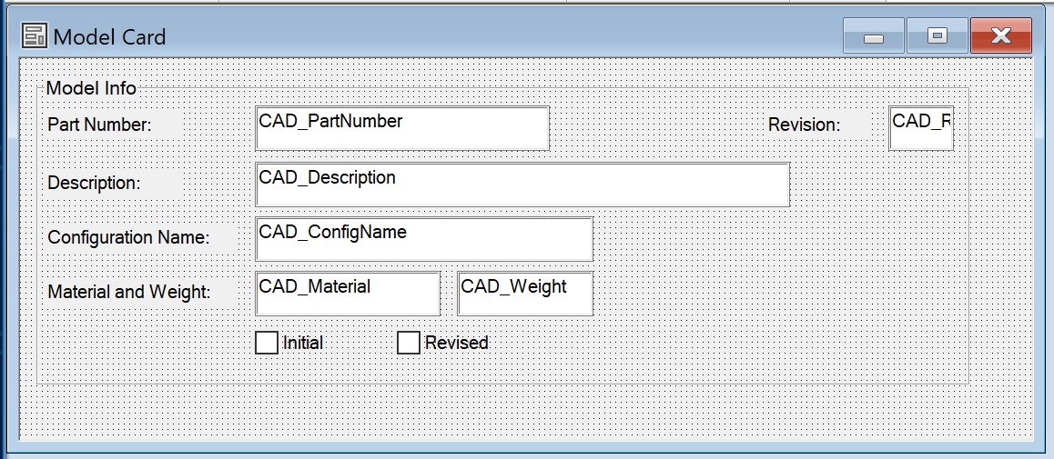 有关数据卡示例,请参见下文。所有变量都映射到SolidWorks自定义属性: