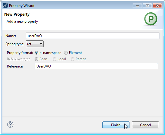 在“Name”字段中键入userDAO,从“Spring Type”下拉列表中选择ref,在“Reference”字段中输入UserDAO,然后单击“完成”。