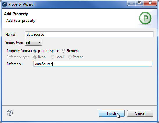 在“Name”字段中输入dataSource,将Spring类型保留为ref,在“Reference”字段中输入dataSource。